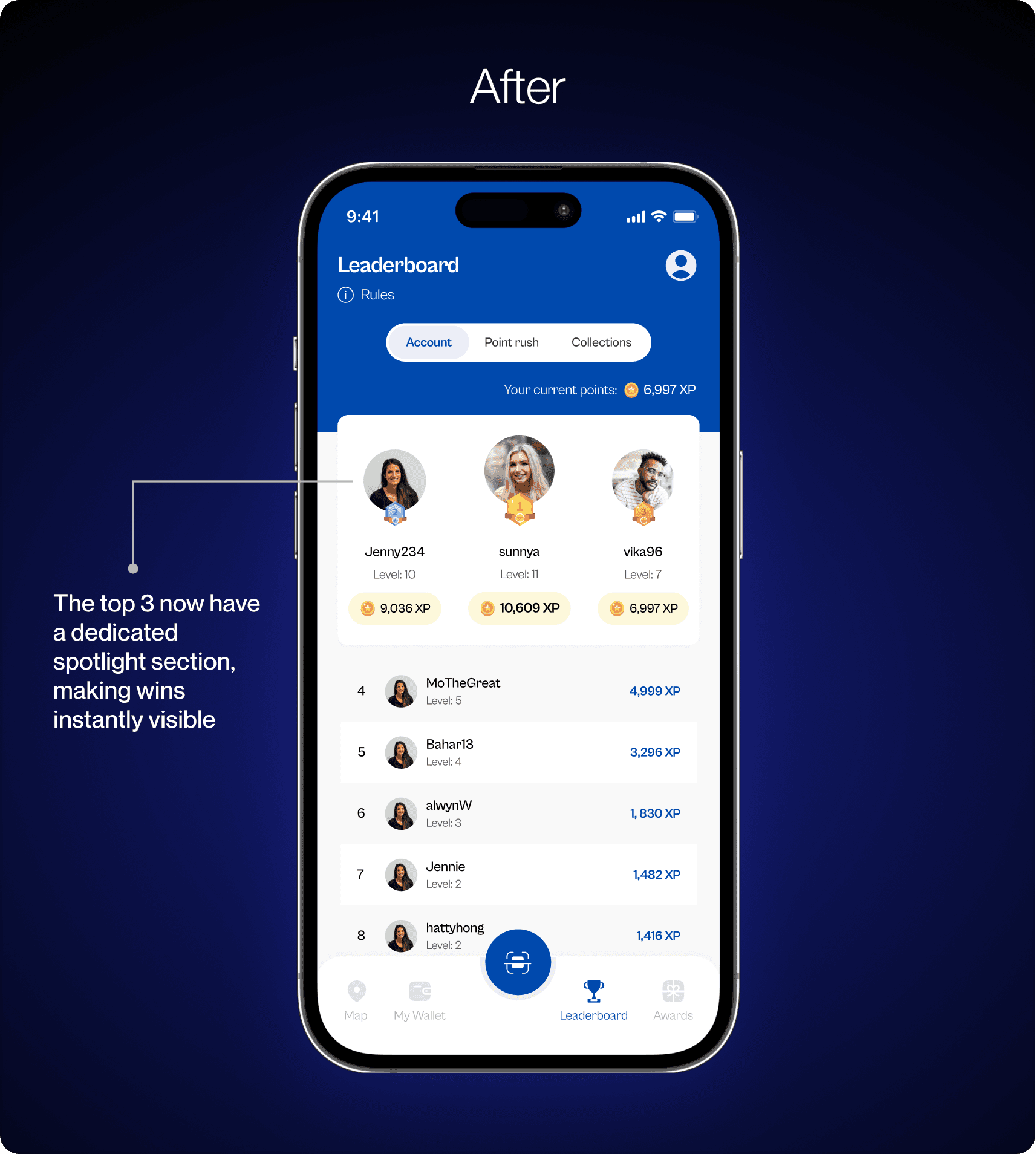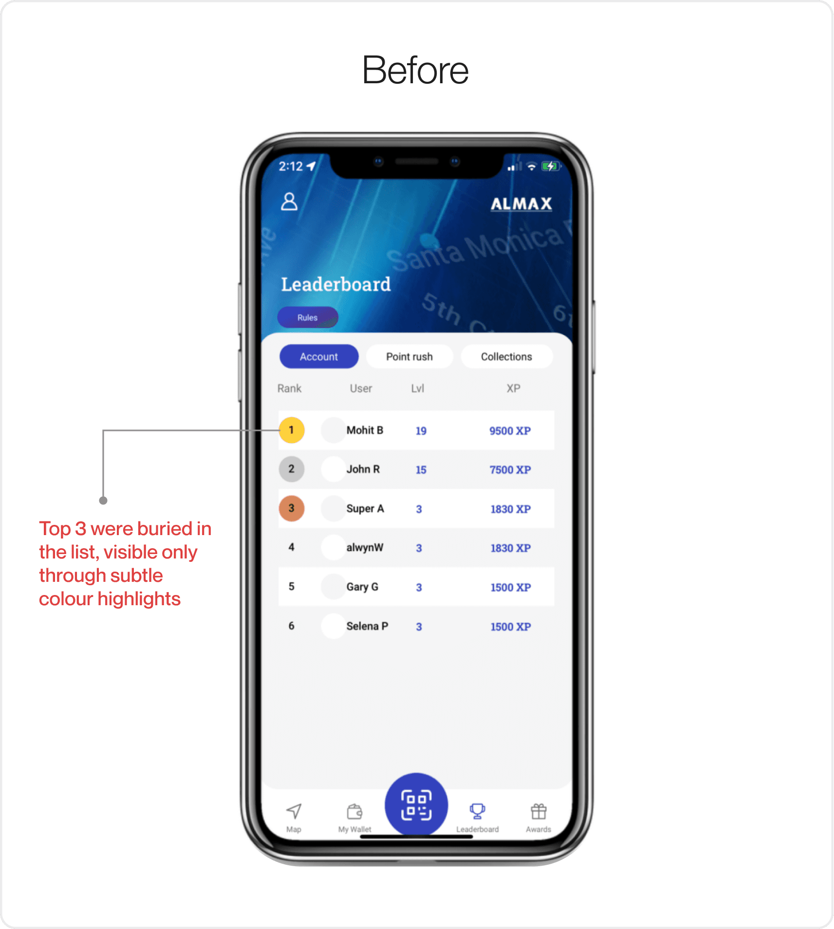 The top 3 point earners were buried within the main list, differentiated only by colour. You had to look closely to notice who was actually winning. It felt like a detail rather than a celebration.