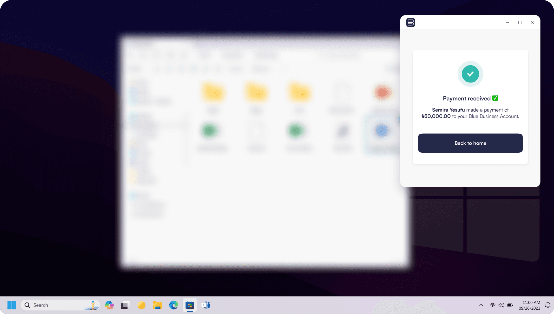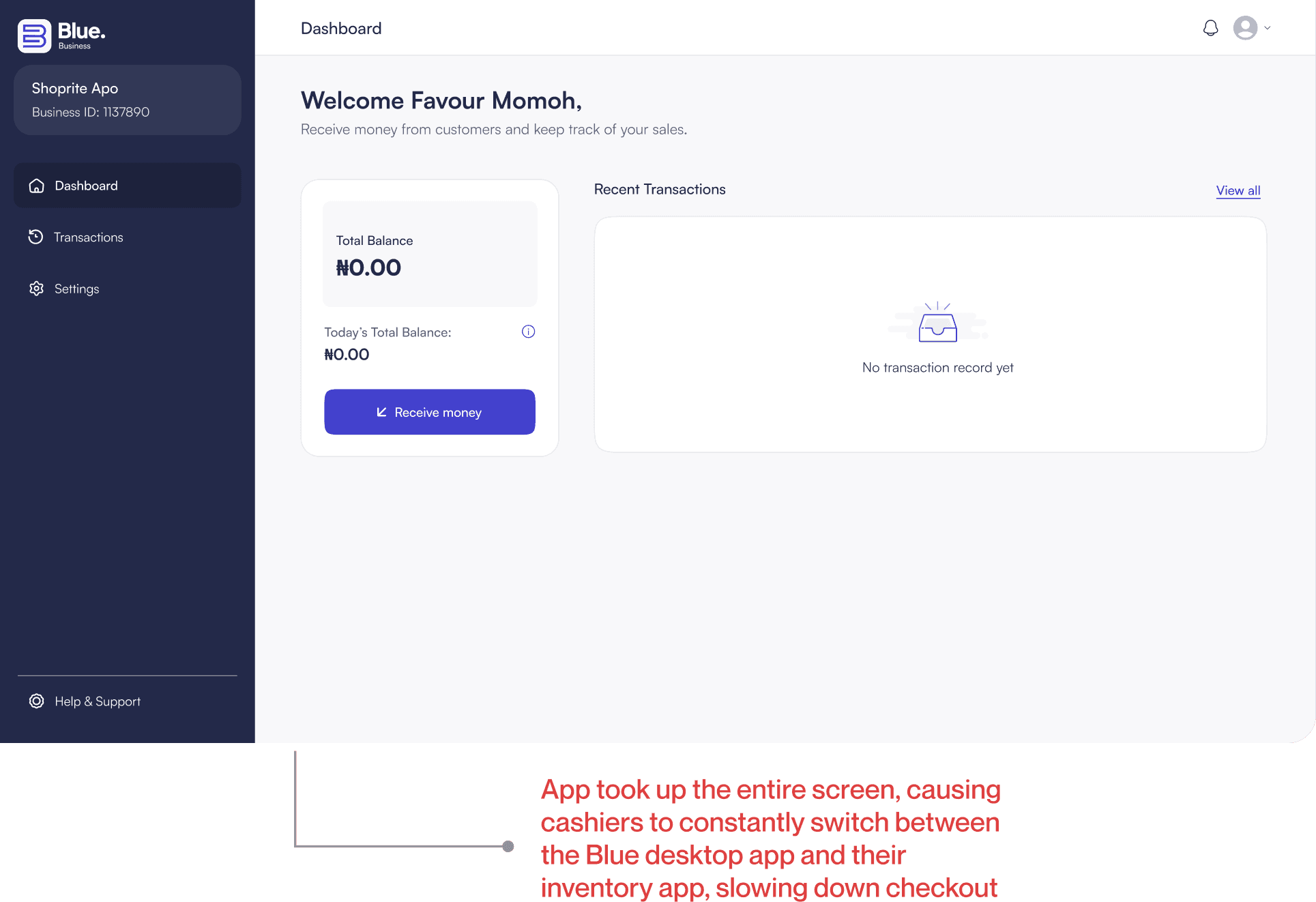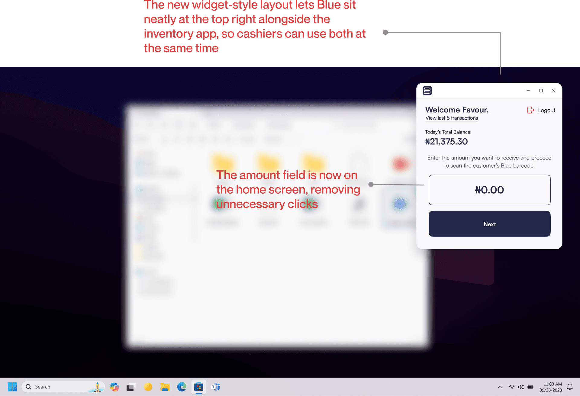 Based on the feedback gotten during the usability tests, we decided to change the approach. Instead of competing with their system and disrupting existing workflows, we redesigned the BlueBusiness Desktop App to work alongside it. We introduced a lightweight, widget-style interface that sat neatly at the top corner of the screen. This allowed cashiers to receive payments without leaving their inventory tool. The impact was immediate. Cashiers could process payments faster, stay focused, and move through transactions without interruption.